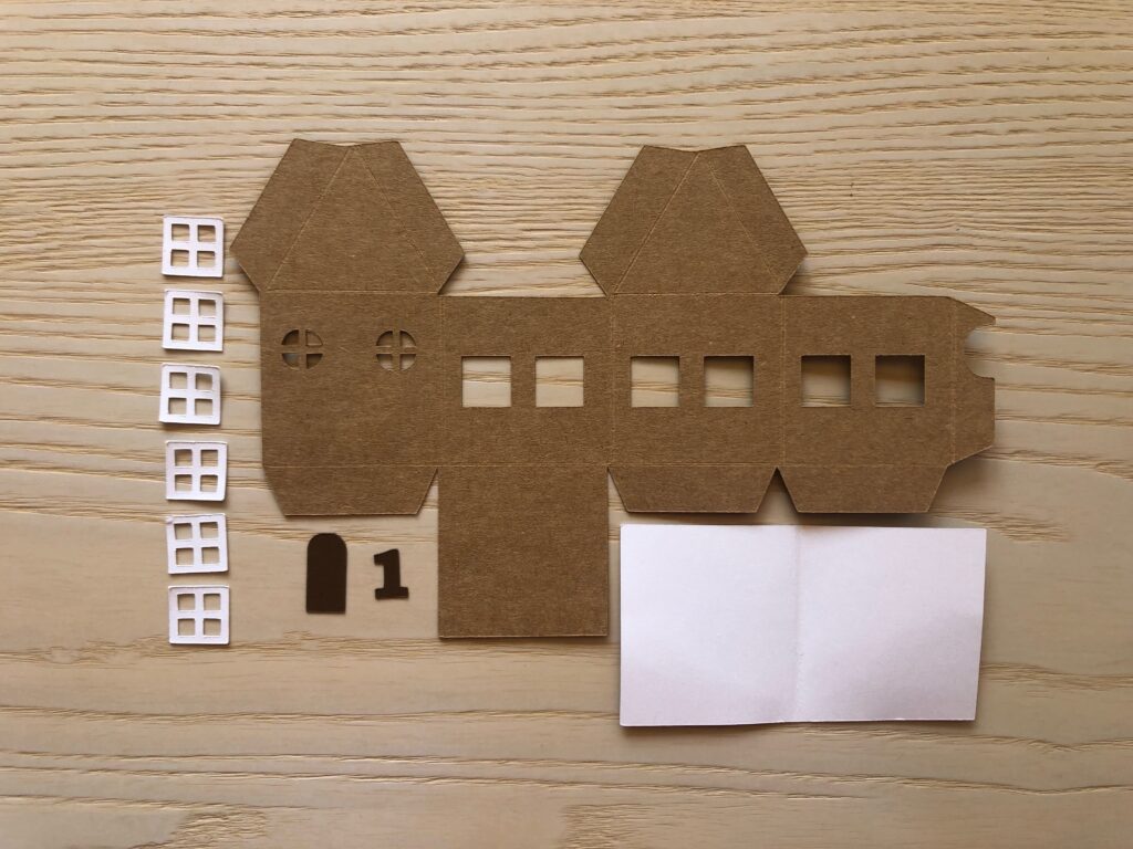 Une fois vos découpes terminées, collez les fenêtres, la porte et le chiffre sur votre première maison.