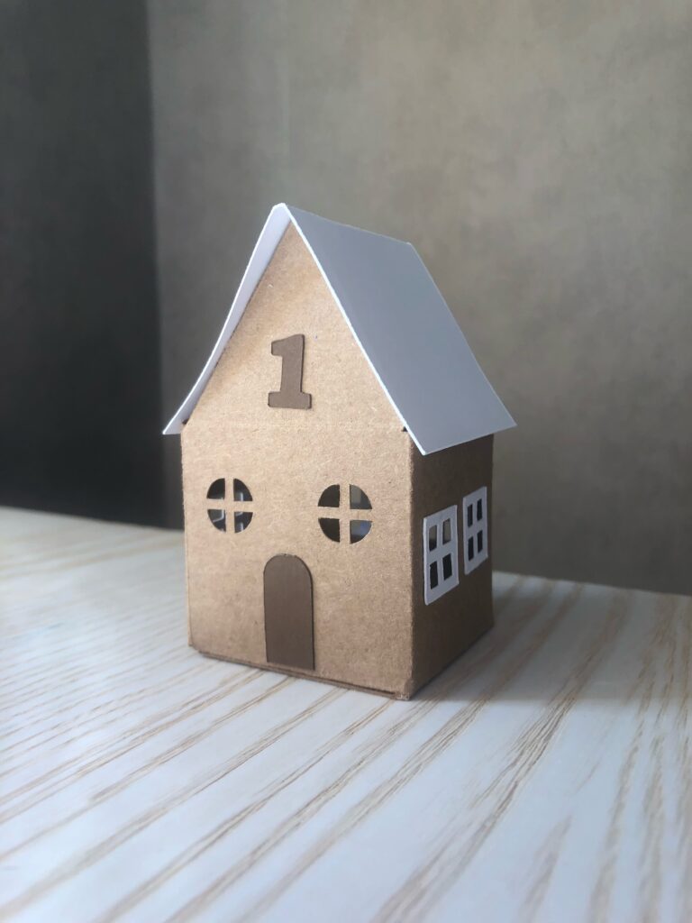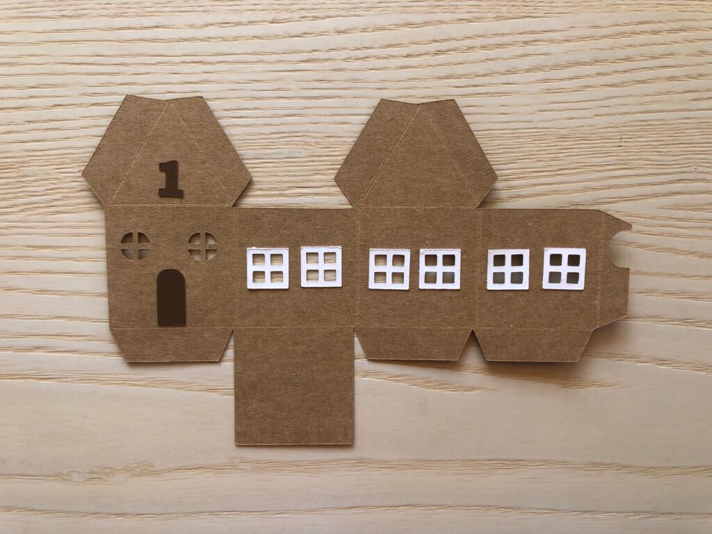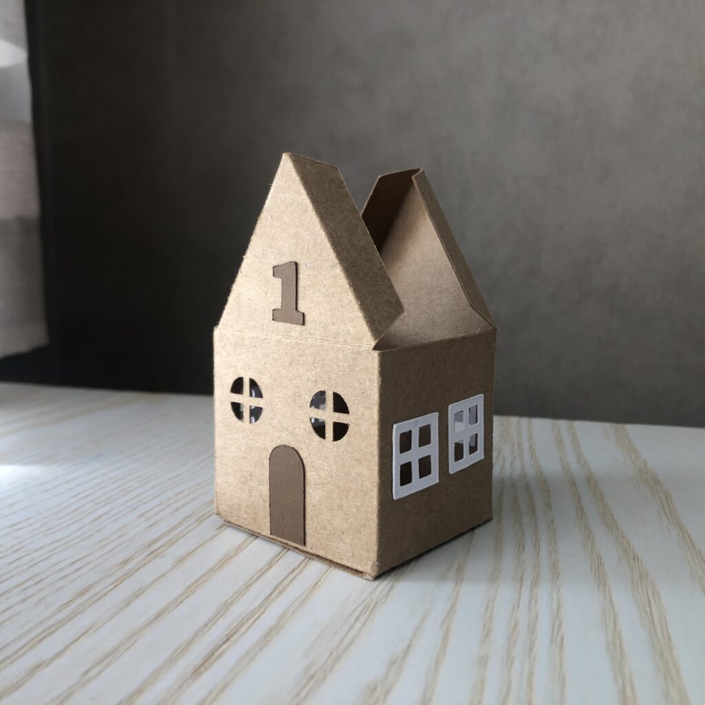 Suivez les lignes de rainure pour plier la maison. Assemblez la avec de la colle. C’est également le moment d’y mettre votre friandise !