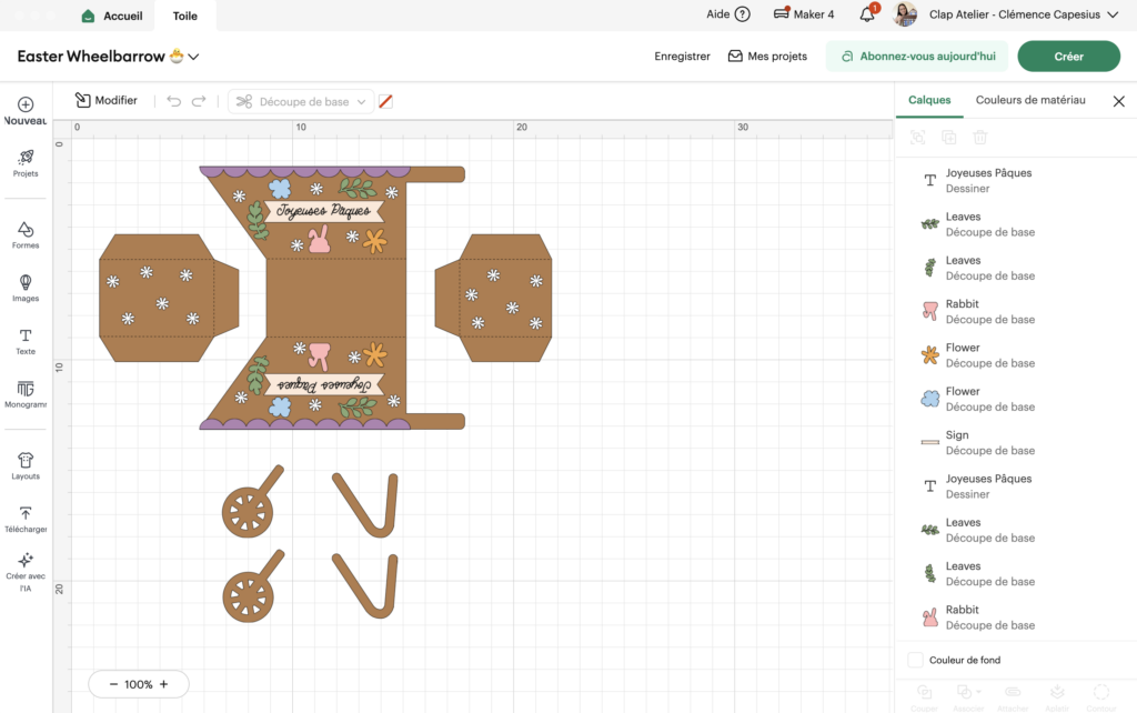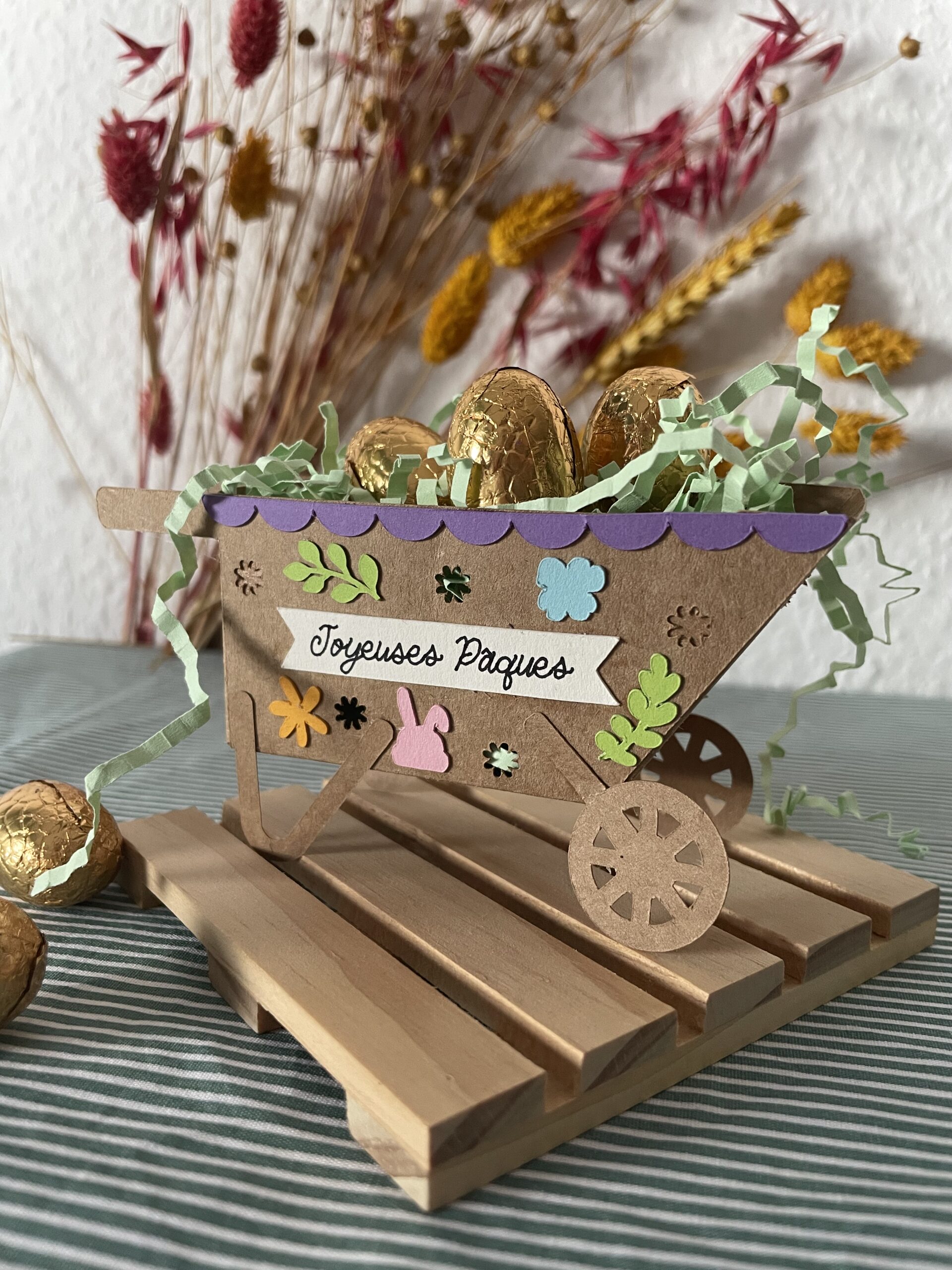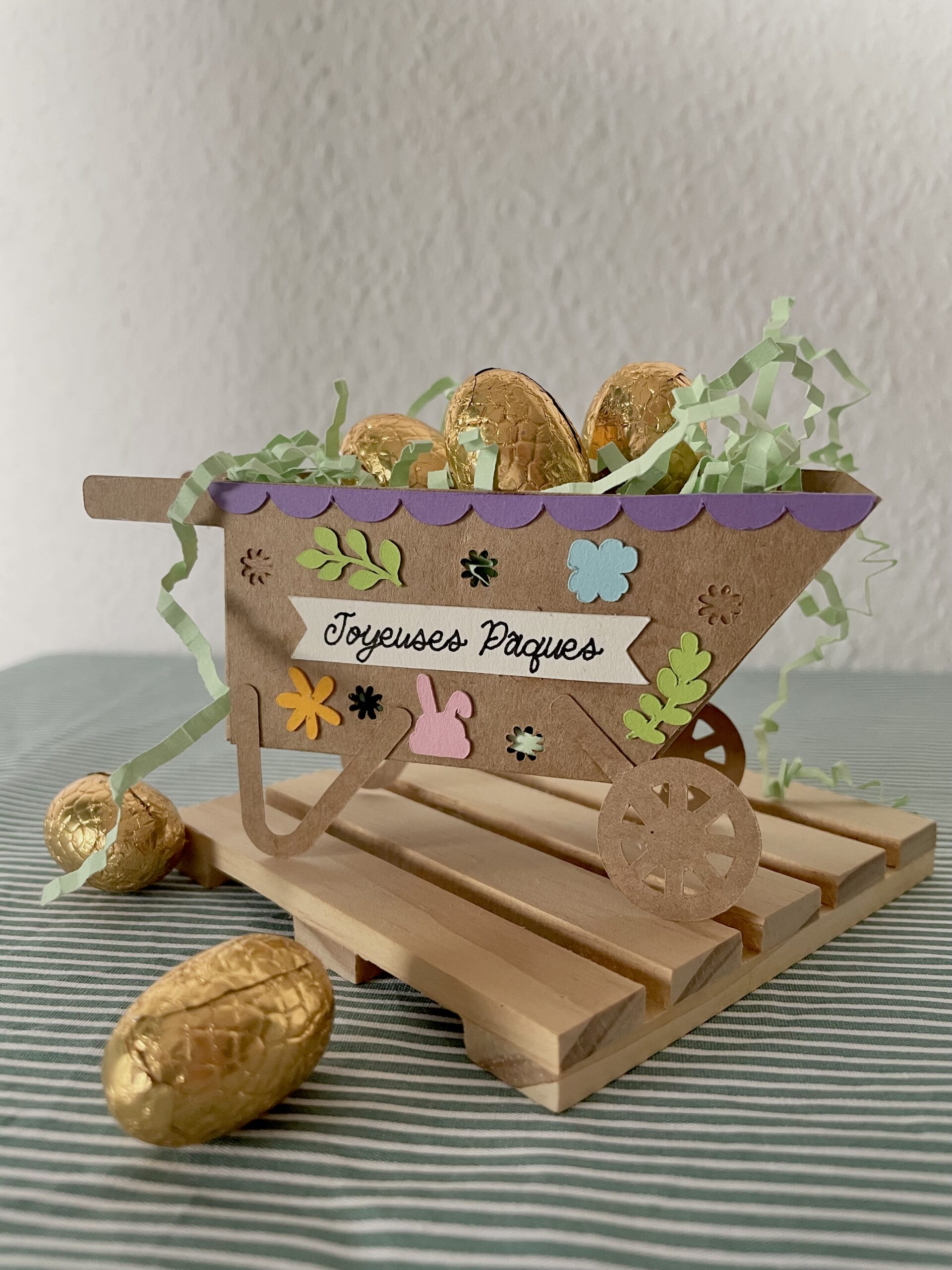 En Alsace, Pâques est une fête importante ! J’aime chaque année faire une petite décoration différente, pour y mettre mes chocolat. Pour cette année, j’ai décidé de créer une brouette de Pâques. J’ai utilisé du papier cartonné découpé avec ma Cricut Maker 4. La taille du panneau est d’environ 12cm de largeur et 6cm de hauteur. Ce projet est compatible avec les machines Cricut Explore et Maker.